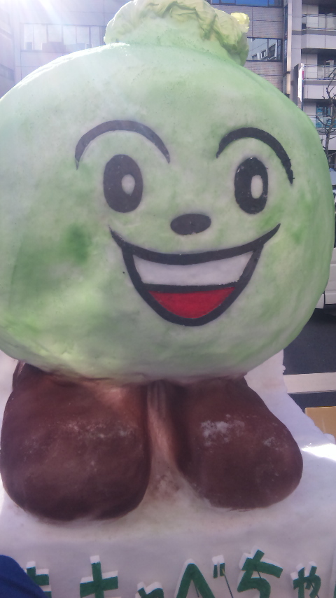 こんにちは! 本日、神田のスポーツ街はたくさんの雪だるまが並んでました☆ 一番近くにあったのは嬬恋の嬬キャベちゃん☆ コレも雪でできた、れっきとした雪だるまちゃんなのです! 頭には生産量日本一を誇るキャベツちゃんが! 嬬恋村には9・13に、愛を叫ぶイベントがあるらしい…。 嬬恋村のHP、見てみて下さいねん☆ |